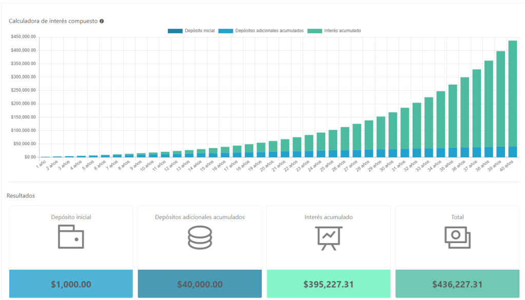 Si mi padre hubiera invertido 1000 cada año en el S&P 500, desde que nací, 40 años después, tendría 395k USD de ganancia por interés acumulado y un total de 436k USD. Sería la mejor herencia que puede recibir un hijo 🙂